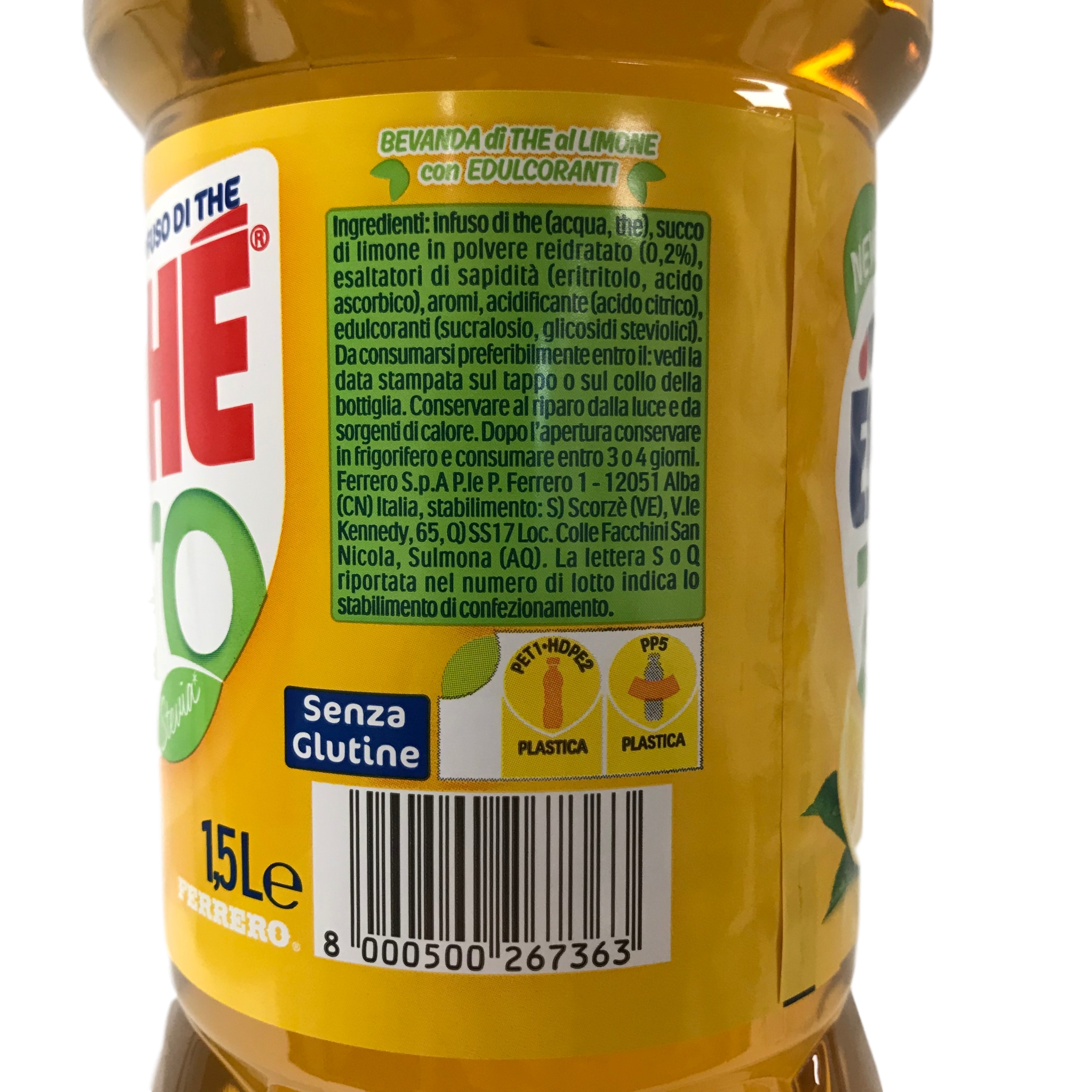 Tea infusion (water, tea), lemon juice rehydrated powder (0.2%), flavour enhancers (erythritol, ascorbic acid), flavourings, acidifier (citric acid), sweeteners (sucralose, steviol glycosides).