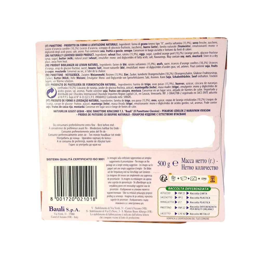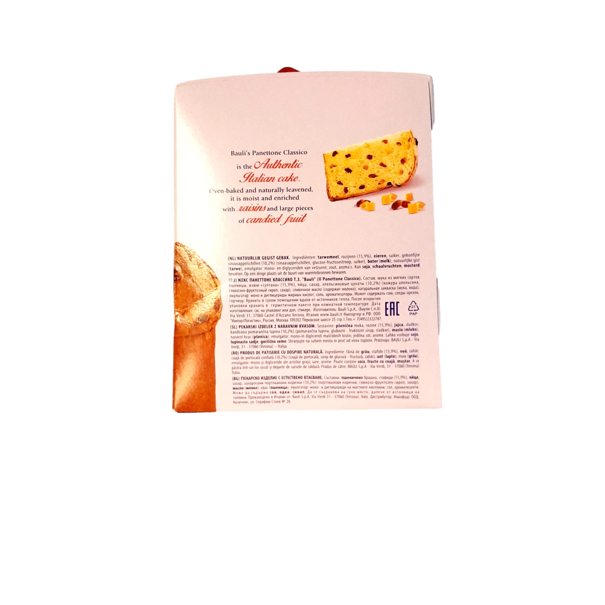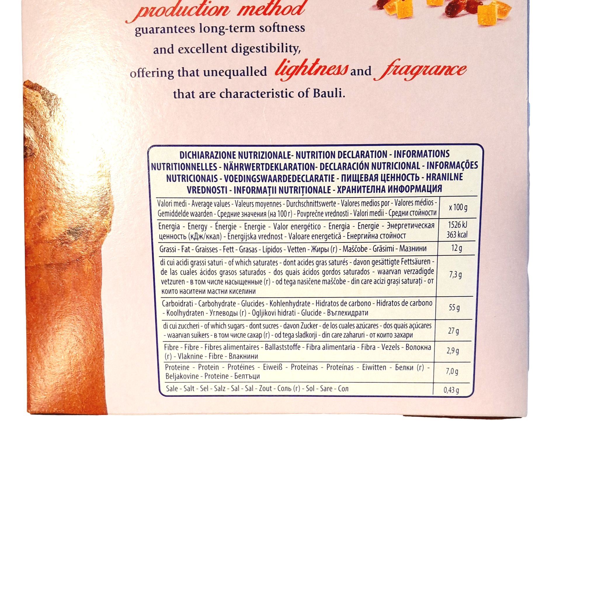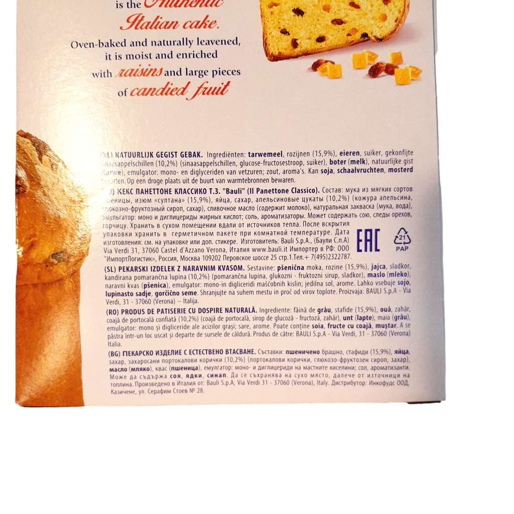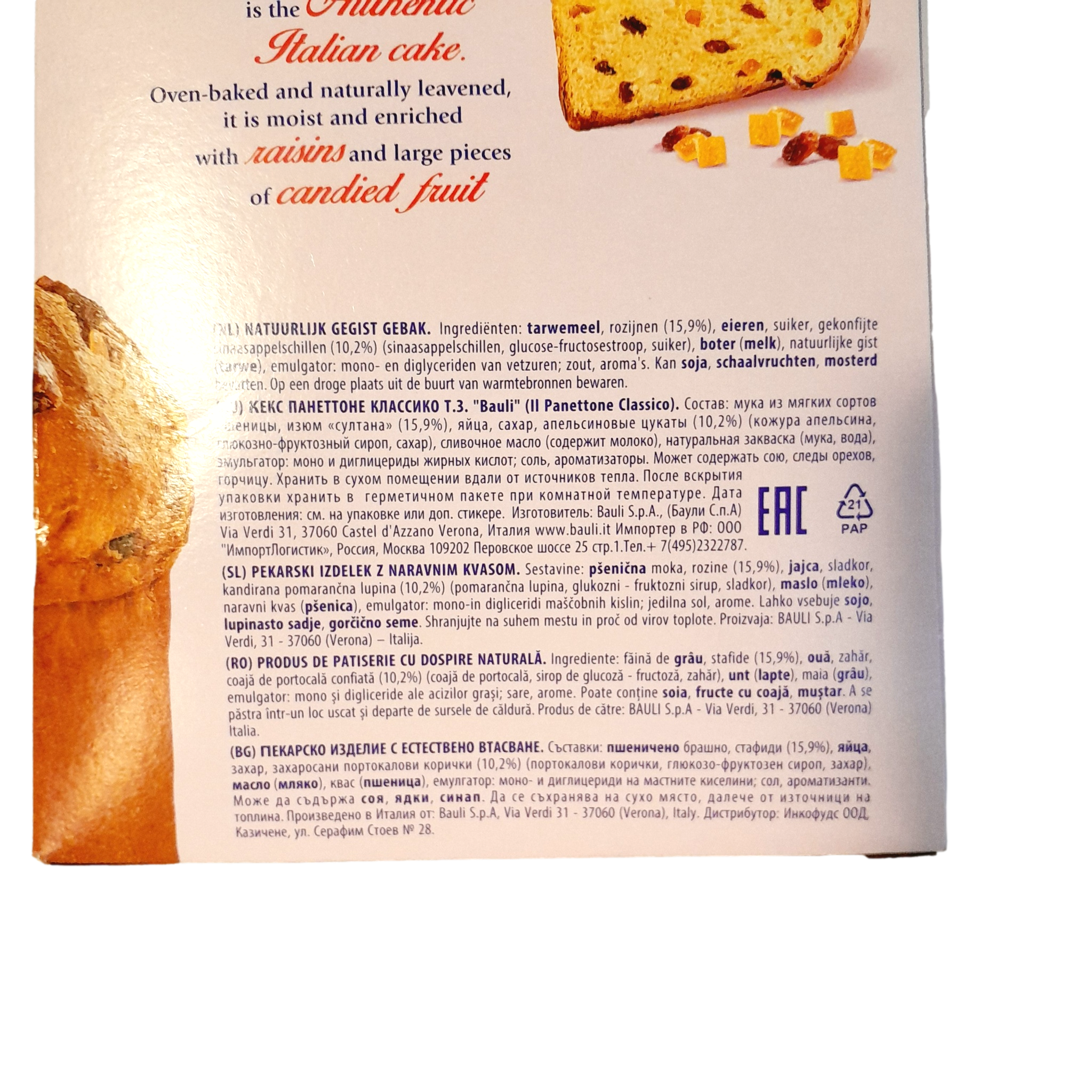 Ingredients: Wheat flour, raisins (15.9%), eggs, sugar, candied orange peel (10.2%) (orange peel, glucose - fructose syrup, sugar) butter, milk, natural yeast (wheat) , emulsifier: mono- and diglycerides of fatty acids, salt flavouring,